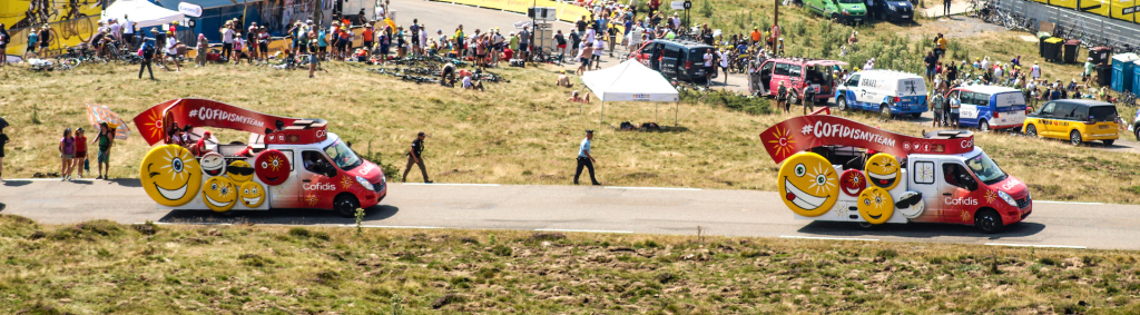 Depuis 2018, nous accompagnons la team COFIDIS sur plusieurs événements cyclistes. Nouveau covering, nouveaux décors 3D aux smileys géants, nul doute que ces véhicules respirent la joie de vivre et la bonne humeur !