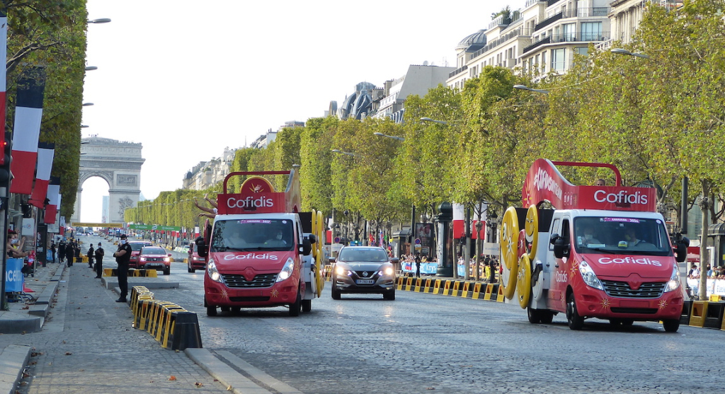 La Caravane COFIDIS ne peut passer inaperçue. Ces véhicules souriants distribuent près de 30 000 cache-cols et maillots. Un animateur micro assure le show tandis que les collaborateurs et invités propagent leurs sourires franco-belges !