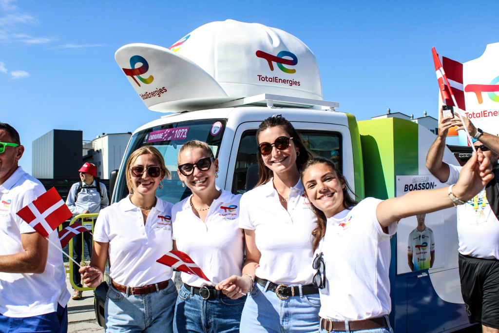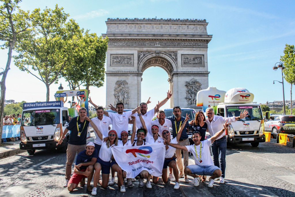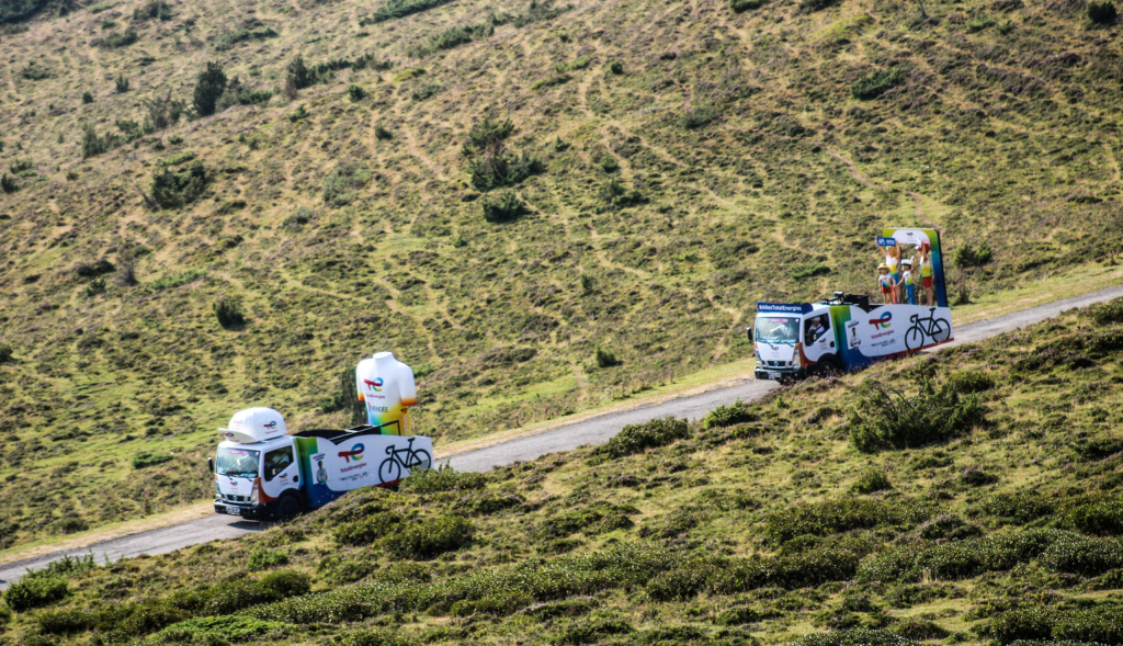 À travers un dispositif aux couleurs de la Team TotalEnergies, ces véhicules mettent l’ambiance pour soutenir son équipe cycliste professionnelle.
